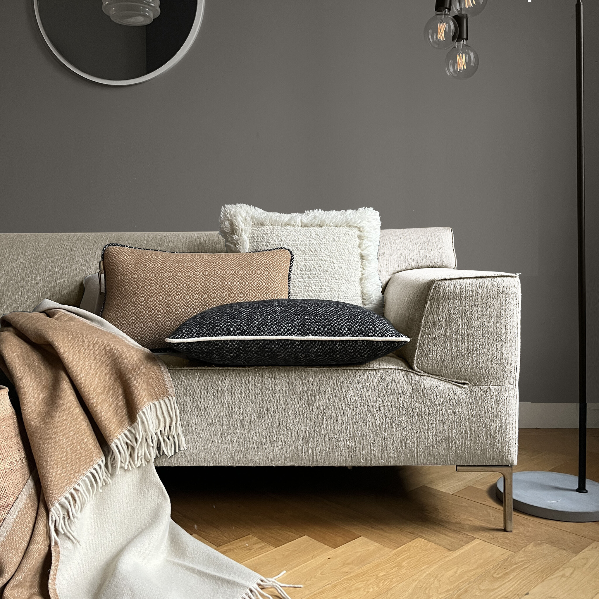 70%Wool 30%Acrylic. 35x60cm. This cushion is 100% made of recycled products. Use this beautiful decorative cushion with a silky feel on your couch to ensure you always have a warm, soft cushion to chill. Dry cleaning only.